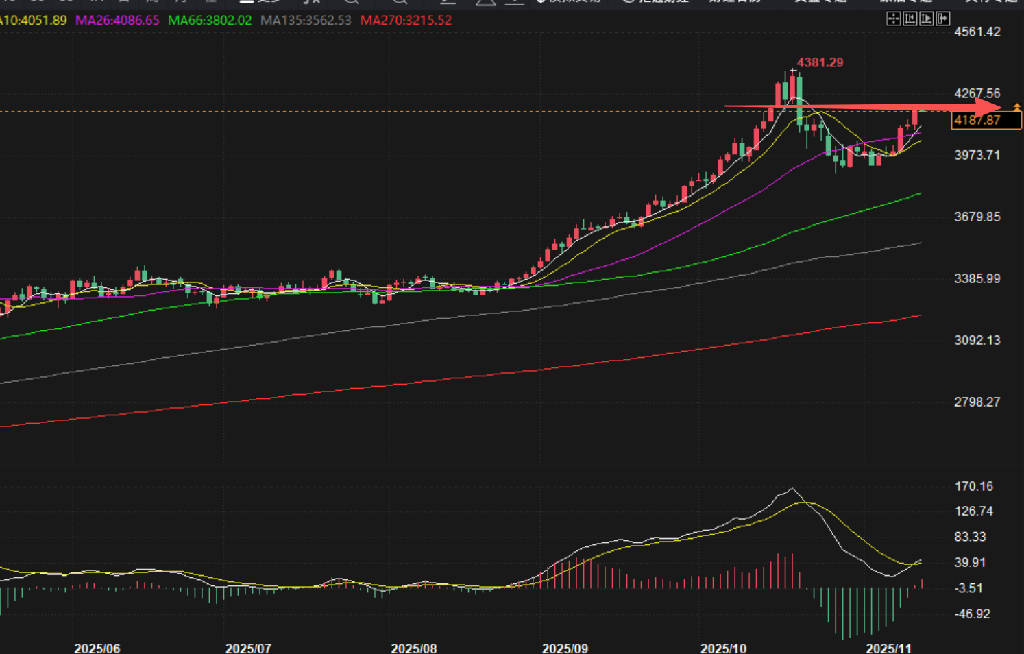 昨日的黄金走势完全印证了早评的前瞻性判断。我们精准锚定的4133-4050核心震荡区间,成为了全天行情运行的“骨架”。日内轨迹清晰可见:白盘自4055一线企稳上扬,美盘时段精准触及区间上轨4133附近后,承压回落,最终回归至起涨原点。日线收出一根带有长上影线的小阳线,直观地揭示了上方压力的有效性。 在此背