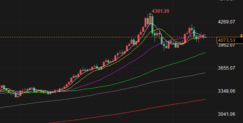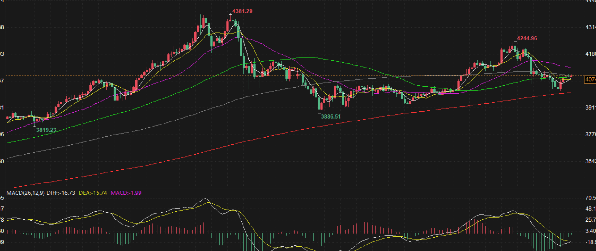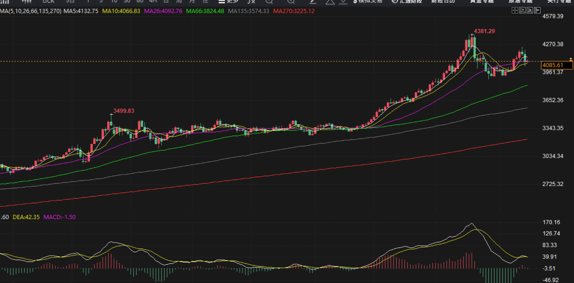 回顾黄金昨日的行情表现,它整体呈现出一种探底回升态势,价格在下3998支撑后,晚间突破4026正式转多,在拉升后回落29二次展开上扬,盘中一度拉到了4082一线,收盘以一根带有下影线较长的小阳线报收。 从日线图的角度来看,昨日黄金以一根带有下影线的小阳线报收。这根K线形态蕴含着丰富的市场信息,下影线的存