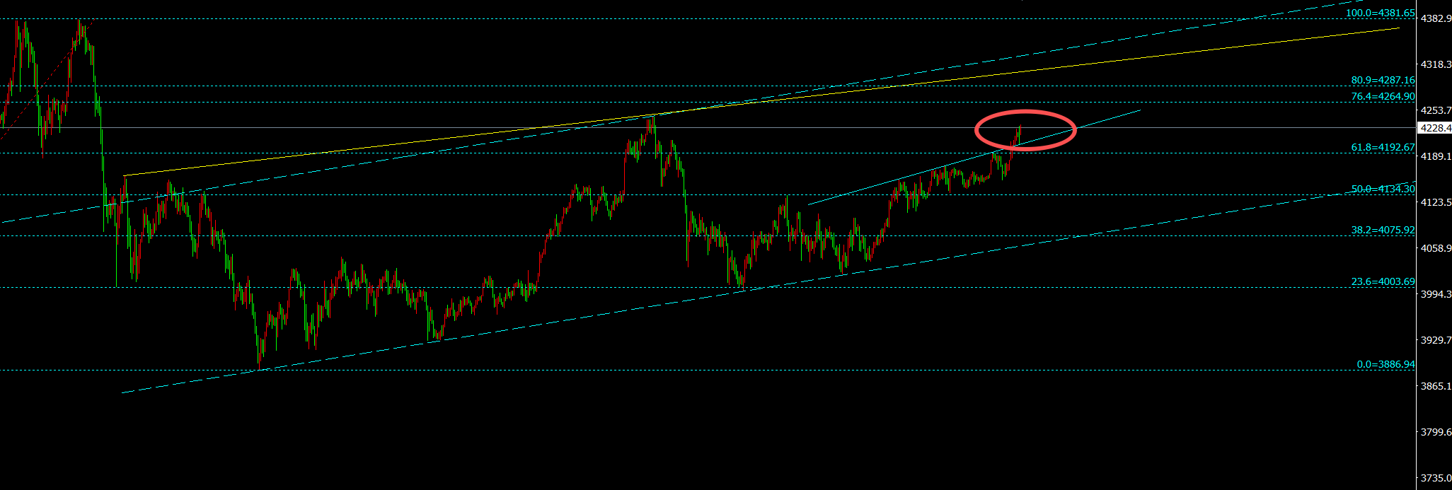 昨天黄金如预期价格下跌到了四小时下线4163这里,尾盘受讲话影响价格重新收回到4210上方,早盘再次小幅收高,从整体来看,昨天的下行对于短期来看有一步到位的迹像,就是晚上AD数据想直接破底机率也不大,这一波是从四小时加速线下跌到下线,而目前运行于中轨附近,可上可下,上方重点是日图上线的压制,过了进一步会去