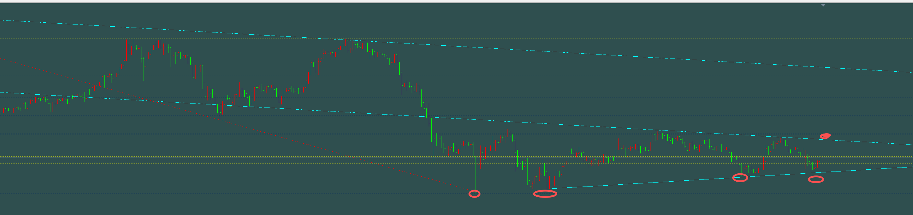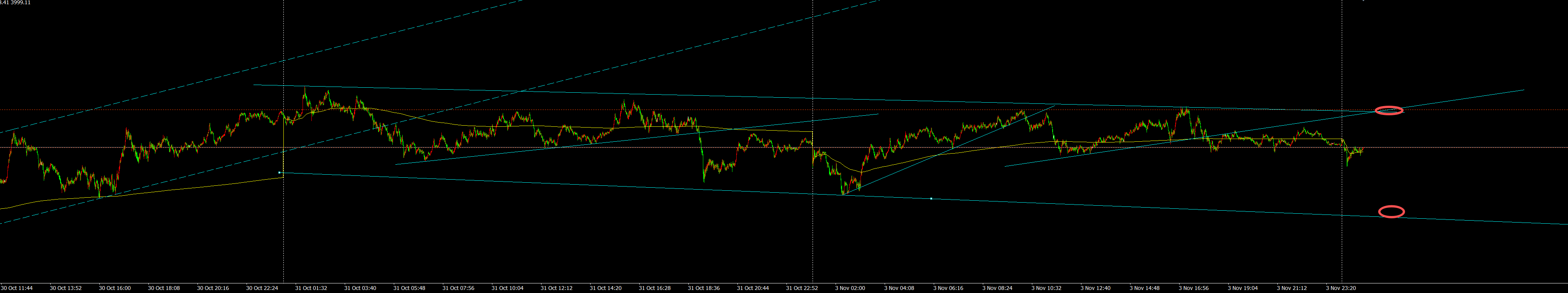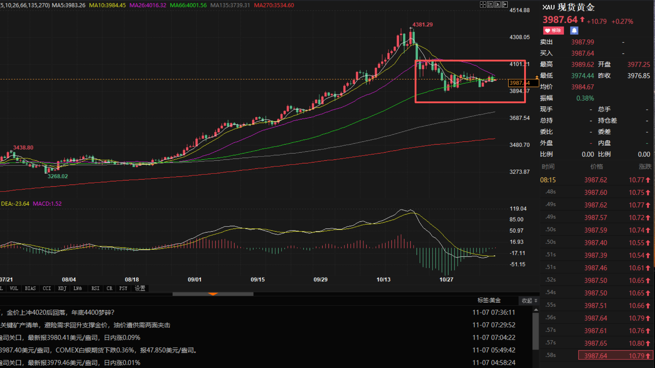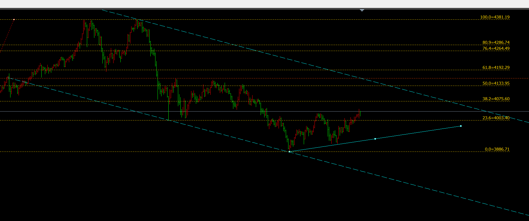 昨天黄金以4020为压制大跌到3886一线,价格靠近了日图下线出现一波反弹,晚间最高到3968上,反弹80美元,收盘以一根上下影线的十字星阴线报收,从盘面来看,早盘再次探底回各项,虽然没有二次到达日图下线,但是到了通道的二次底线上扬,短期来看日图有下跌企稳迹像,二次回防空档预期会,而四小时也出现了二次在加速线