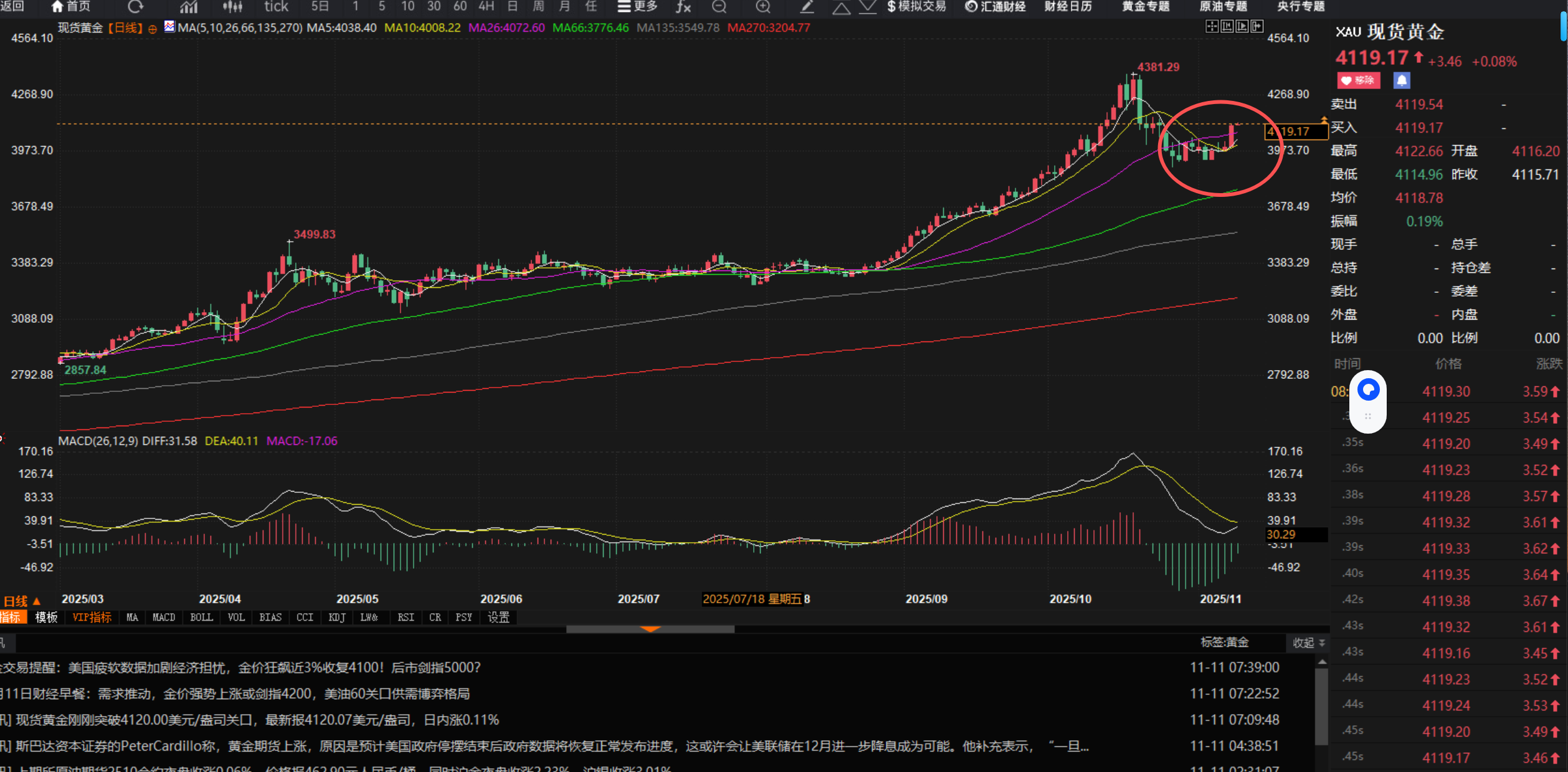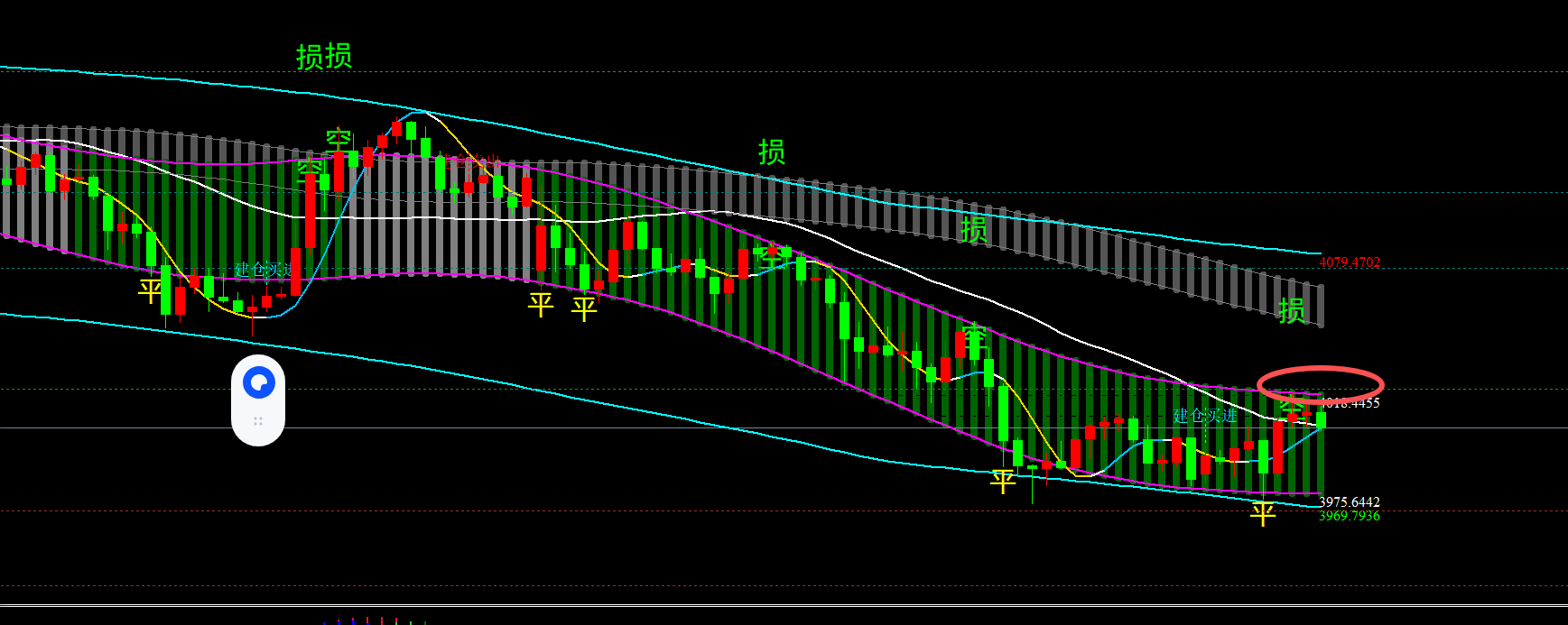 昨天黄金分三个阶段,第一阶段早盘回落4062上和72第一波反弹4107,第二波到88,到欧盘开启破位下跌,第二阶段就是到晚间反弹反压力下行,到美盘中段基本是打一个低点反弹15-17美元开空继续下跌,后边给出的几个空基本如此,而对于当下来看,日图收盘大阴在30天线均线支撑,四小时在靠近加速线反弹,早盘探底回升反弹到30