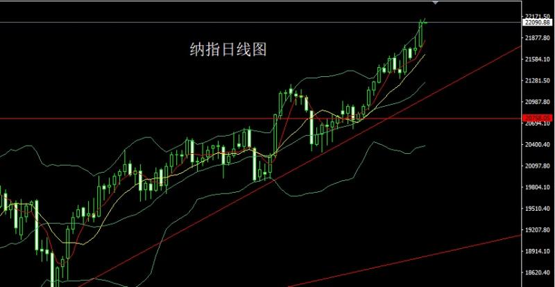 纳指昨日再度创造历史,早盘小幅高开在21763.85的位置后行情小幅回补缺口给出21738.35的位置后行情强势震荡拉升,日线最高触及到了22132.9的位置后行情整理,日线最终收线在了22087.89的位置后行情以一根略带影线的大阳线收线,而这样的形态收尾后,市场只能顺势回踩多点位上,今日先回落21900多止损21850, 目标看22100和22150,破位看22250和22300.