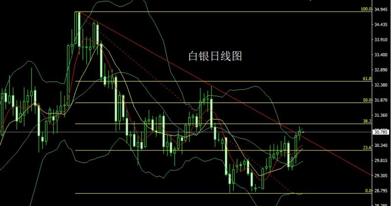 白银市场昨日开盘在30.671的位置后行情先拉升给出30.69的位置后行情快速回落,日线最低给到了30.503的位置后行情强势拉升,日线最高触及到了30.967的位置后行情整理,日线最终收线在了30.807的位置后行情以一根上下影线等长的纺锤形态收线,而这样的形态收尾后热线有效上破本轮下行趋势线,今日30.5多止损30.3,目标看30.85和31,破位的话看31.2-31.4.