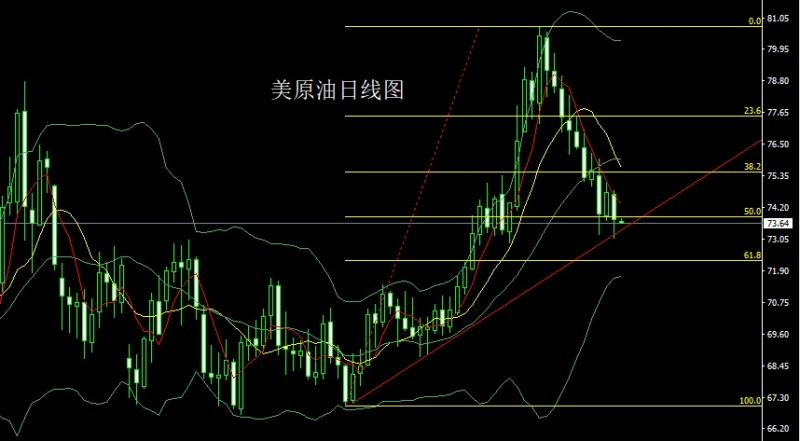 美原油市场昨日开盘在74.69的位置后行情先小幅回落给出74.31的位置后行情快速拉升,日线最高触及到了74.83的位置后行情展开回落过程,日线最低给到了73.07的位置后行情整理,日线最收线在了73.75的位置后行情以一根下影线很长的大阴线收线,而这样的形态收尾后,日线双阴夹阳,今日的行情先拉升给出74.5空止损75,目标看73.5和73,跌破看72.3和72.