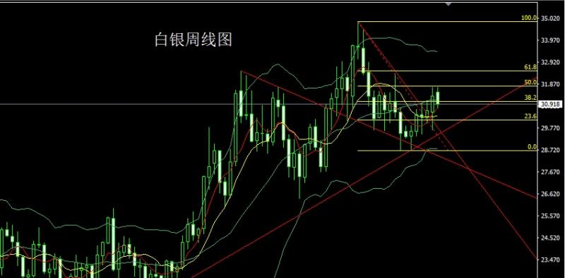 白银市场上周开盘在30.512的位置后行情先回落,周线最低给到了29.678的位置后行情强势拉升,周线最高触及到了31.727的位置后行情受到本轮回落斐波那契的50压力整理,周线最终收线在了31.304的位置后行情以一根下影线长于上影线的大阳线收线,今日30.5多止损30.3,目标看31.2和31.5-31.7。