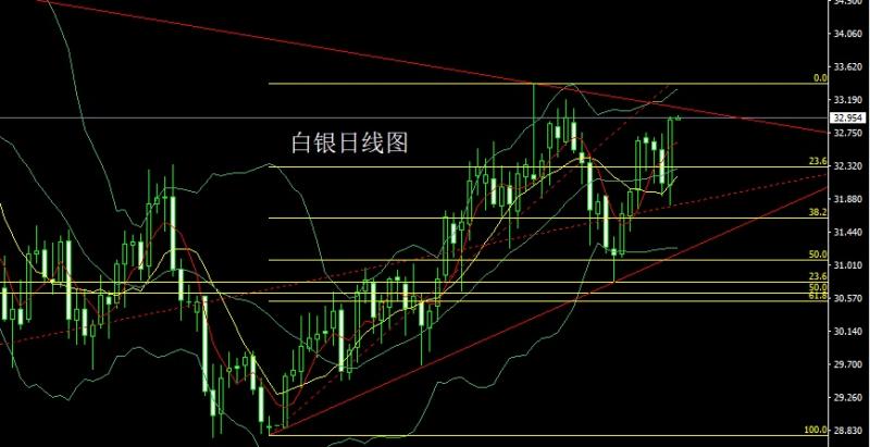 昨日白银市场早盘低开在32.069的位置后行情先回落,日线最低给到了31.796的位置后行情强势拉升,日线最高触及到了32.964的位置后行情整理,日线最终收线在了32.928的位置后行情以一根下影线很长的大阳线收线,而这样的形态收尾后,日线反转阳包阴,今日的行情回踩多,点位上,今日32.6多止损32.4,目标看33,破位看33.2和33.5。