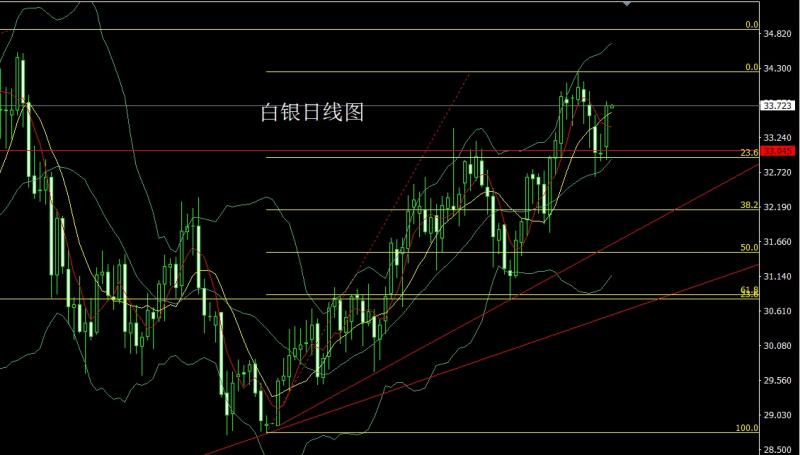 昨日白银市场早盘高开在33.1的位置后行情直接回落给出日线低点32.9的位置后行情强势震荡拉升,日线最高触及到了33.796的位置后行情整理,日线最终收线在了33.723的位置后行情以一根下影线很长的大阳线收线,而这样的形态收尾后,今日的行情有看多需求,点位上,今日先回落的话给出33.35多止损33.15,目标看33.8和34-34.2.