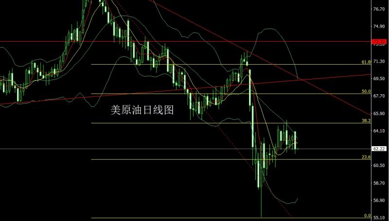 美原油市场昨日高开在64.02的位置后行情小幅拉升给出64.07的位置后行情冲高回落,日线最低给到了61.73的位置后行情整理,日线最终收线在了62.17的位置后行情以一根下影线很长的大阴线收线,而这样的形态收尾后,今日63空止损63.5,下方目标看62.3和61.7,跌破看61.2和61.