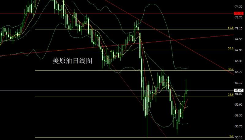 美原油市场昨日高开在61.45的位置后行情先回落回补缺口给出61.01的位置后行情强势拉升,日线最高触及到了63.64的位置后行情冲高回落,日线最终收线在了62.02的位置后行情以一根上影线很长的倒锤头形态收线,而这样的形态收尾后,今日63空止损63.6,目标看62.2和61.45和61.