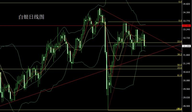 白银市场昨日早盘小幅高开在32.925的位置后行情先拉升给出32.966的位置后行情强势回落,日线最低给到了32.07的位置后行情整理,日线最终收线在了32.214的位置后行情以一根下影线很长的大阴线收线,而这样的形态收尾后,今日32.5空止损32.7,下方目标看32,跌破看31.8和31.65和31.5.