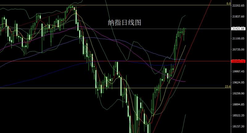 昨日纳指市场早盘低开在21234.2的位置后行情回补缺口给出21341.11的位置后行情强势回落,日线最低给到了21029.88的位置后行情强势拉升,日线最高触及到了21464.65的位置后行情整理,日线最终收线在了21433.76的位置后行情以一根下影线很长的中阳线收线,而这样的形态收尾后,今日21250多止损21150,目标看21400和21450,破位看21550和21650.