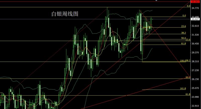 白银市场上周开盘在32.282的位置后行情先回落给出32.097的周线低点后行情强势拉升,周线最高触及到了33.691的位置后行情整理,周线最终收线在了33.497的位置后行情以一根上下影线等长的大阳线收线,而这样的形态收尾后,本周33.15多止损32.95,目标看33.5和33.7破位看34和34.2-34.5.