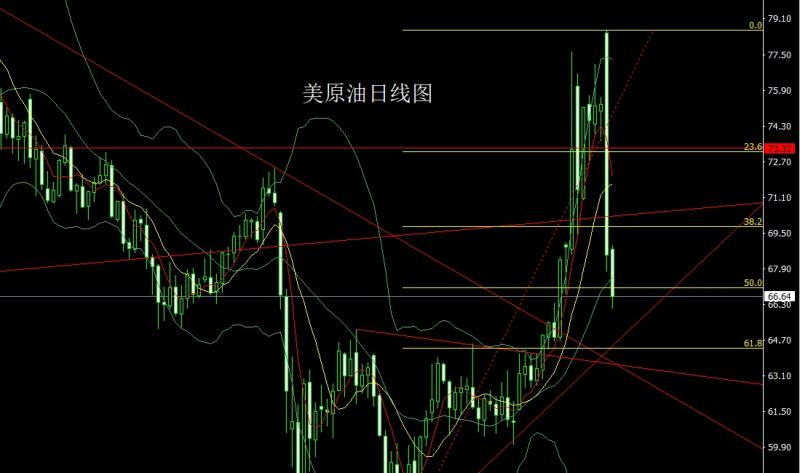 美原油市场昨日高开在78.44的位置后行情先拉升给出78.57的位置后行情强势震荡回落,日线最低给到了67.77的位置后行情整理,日线最终收线在了68.53的位置后行情以一根下影线稍长的大阴线收线,而这样的形态收尾后今日67.7空。止损68.3下方目标看67和66.3和65.5和65.