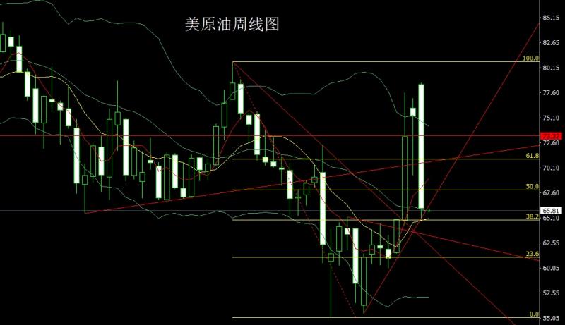 美原油市场上周高开在78.45的位置后行情小幅拉升给出78.59的位置后行情强势回落,周线最低给到了65.08的位置后行情整理,周线最终收线在了66.03的位置后行情以一根下影线很长的大阴线收线,而这样的形态收尾后,本周66.8空止损67.1下方目标看66.2和66和65.5和65.跌破的话看64和63.