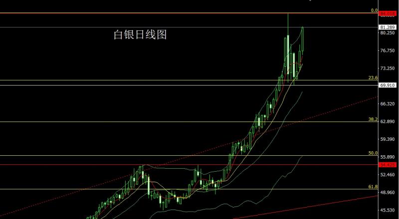 昨日白银市场早盘开盘在76.652的位置后行情先回落,日线最低给到了75.836的位置后行情强势拉升,日线最高触及到了81.448的位置后整理,日线最终收线在了81.1附近后,日线以一根下影线较长的大阳线收线,而这样的形态收尾后,下方37.8的多和38.8的50.75的多和52.7的多减仓后止损跟进在68,今日79.3多止损79,目标看80.5和81.2和81.6和82-82.6
