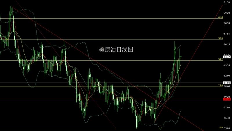 美原油市场昨日开盘在63.81的位置后行情先回落,日线最低给到了62.88的位置后行情强势拉升,日线最高触及到了65.58的位置后行情尾盘回落,日线最终收线在了65.44的位置后,日线以一根上下影线等长的中阳线收线,而这样的形态收尾后,今日63.5多止损63,目标看64.5和65.5和66-66.5.