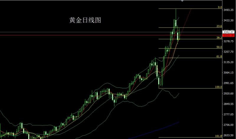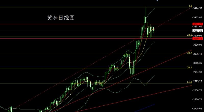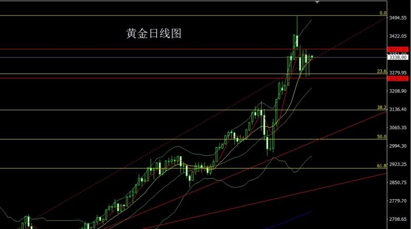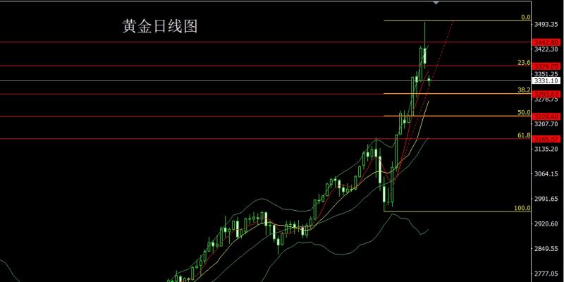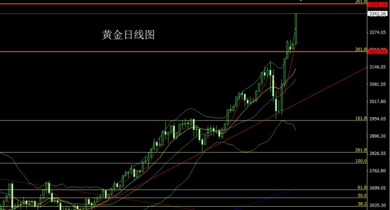 昨日黄金市场强势拉升,早盘开盘在3242.7的位置后行情先回落,日线最低给到了3237.1的位置后行情震荡拉升,给出3272的位置后行情回落给出3252的位置后行情强势拉升,日线最高触及到了3337.8的位置后行情整理,日线最终收线在了3333.9的位置后行情以一根下影线稍长于上影线的大阳线收线,而这样的形态收尾后,今日的行情