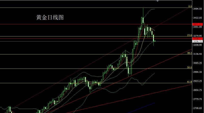 昨日黄金市场早盘开盘在3287.6的位置后行情小幅拉升给出3290.6的位置后行情强势回落,日线最低给到了3200.8的位置后行情尾盘拉升,日线最终收线在了3238的位置后行情以一根下影线很长的大阴线收线,而这样的形态收尾后,上周3496和3468和3442的空减仓后止损跟进在3400持有,今日先回落3216多止损3210,目标看3245和3252