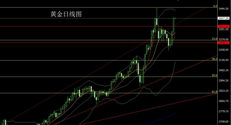 黄金市场昨日早盘开盘在3331.4的位置后行情小幅回踩3328.6的位置后行情强势震荡拉升盘中破位3358的前一周高点和3387压力以及3400整数关口压力后最高触及到了3430.8的位置后行情整理,周线最终收线在了3424.8的位置后行情以一根基本饱和大阳线收线,而这样的形态收尾后,今日的行情在避险和看多情绪带动下依旧有看多需求