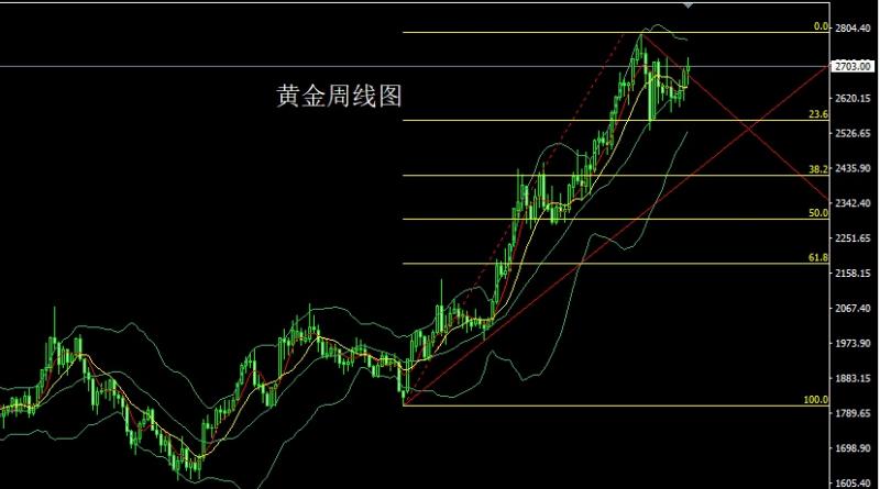 上周黄金市场延续前两周的拉升过程,周初开盘在2690.6的位置后行情先回落,周线最低给到了2656.5的位置后行情受到周线级别五日均线和基本面避险因素影响行情震荡拉升,到周四周线最高触及到了2724.8的位置后行情承压整理,周线最终收线在了2703的位置后。周线以一根下影线长于上影线的高位纺锤形态收线,而这样的形态收