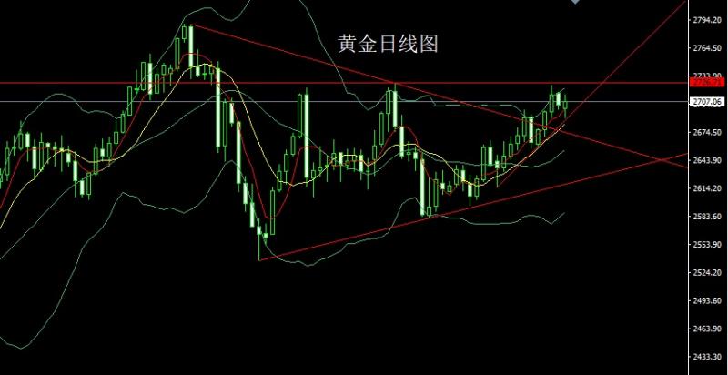 昨日黄金市场早盘低开在2699.5的位置后行情先回落,日线最低给到了2689的位置后行情受到本轮短期上行趋势线支撑拉升,日线最高触及到了2714的位置后行情回落,给出2700.1的位置后行情整理,日线最终收线在了2707的位置后行情以一根下影线稍长于上影线的纺锤形态收线,而这样的形态收尾后,今日如果先回落给出2701多止损2