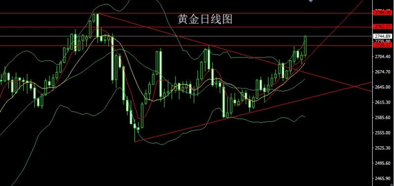 昨日黄金市场早盘开盘在2707.3的位置后行情先回落,日线最低给到了2702.3的位置后行情强势拉升,日线最高触及到了2746的位置后行情整理,日线最终收线在了2744.9的位置后行情以一根下影线较长的大阳线收线,而这样的形态收尾后,日线有效上破本轮旗形整理颈线,今日的行情回踩延续多,点位上,今日如果先回落2727多保守2