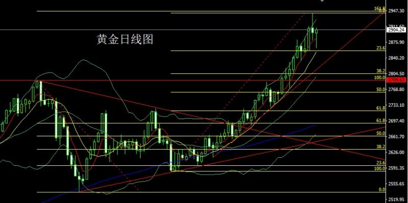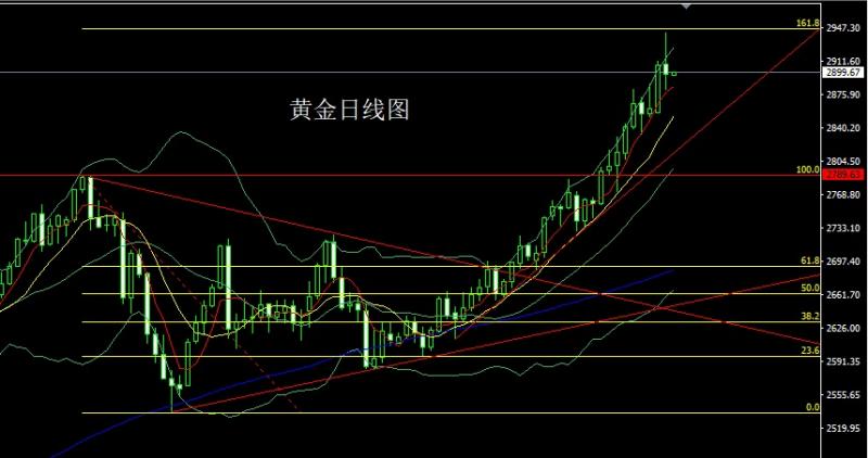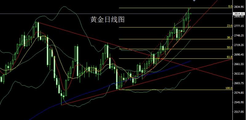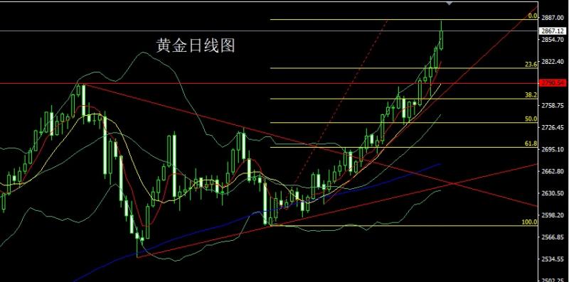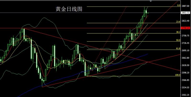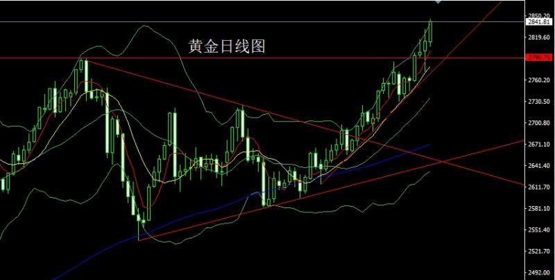 昨日黄金市场早盘开盘在2841.5的位置后行情小幅回踩给出2839的位置后行情一路震荡拉升,美盘时段日线最高触及到了2882.4的位置后行情尾盘获利了结调整,日线最终收线在了2867.1的位置后行情以一根上影线很长的大阳线收线,而这样的形态收尾后,虽然趋势依旧看涨,但技术上已经有较强的超买信号,所以第一波冲击2900整数