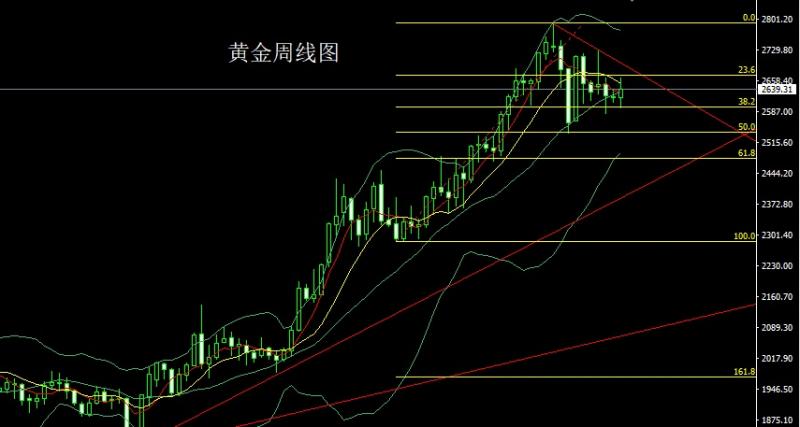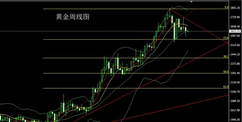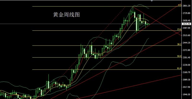 上周黄金市场周初行情开盘在2650.3的位置后行情小幅拉升给出2664.7的位置后行情震荡回落,周线最低给到了2582.6的位置后行情尾盘拉升,周线最终收线在了2622.8的位置后行情以一根下影线很长的类锤头形态收线,而这样的形态收尾后,周线搓揉整理,点位上,今日如果先回落2603多止损2597,目标看2625和2632,破位看2638和2