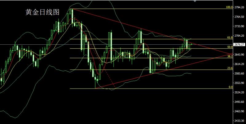 昨日黄金市场早盘开盘在2676.7的位置后行情先回落给出2669的位置后行情强势拉升,日线最高触及到了2697.3的位置后行情整理,日线最终收线在了2696.2的位置后行情以一根下影线很长的大阳线收线,而这样的形态收尾后,日线有效站稳三角压力上轨,今日2685多止损2680,目标看2700,破位看2708和2716-2720压力。 白