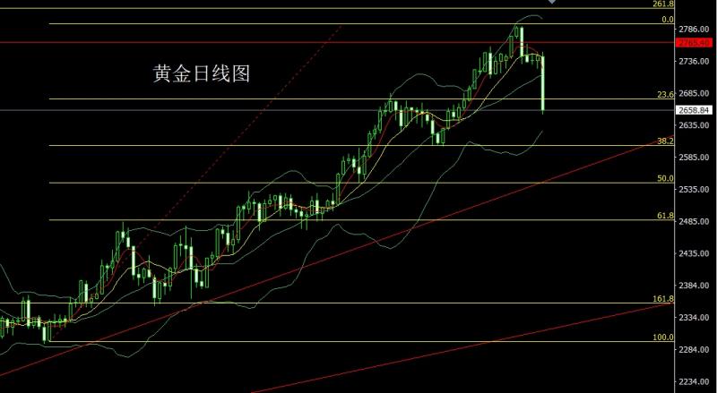 昨日黄金市场受到美国大选影响大幅波动,早盘开盘在2742.6的位置后行情先拉升,日线最高触及到了2750附近压力后行情受到美国大选结果懂王再次当选的影响行情展开回落过程,跌破2724的前日低点后行情加速回落,日线最低给到了2650.7的位置后行情整理,日线最终收线在了2658.8的位置后行情以一根上下影线等长的超级大阴线