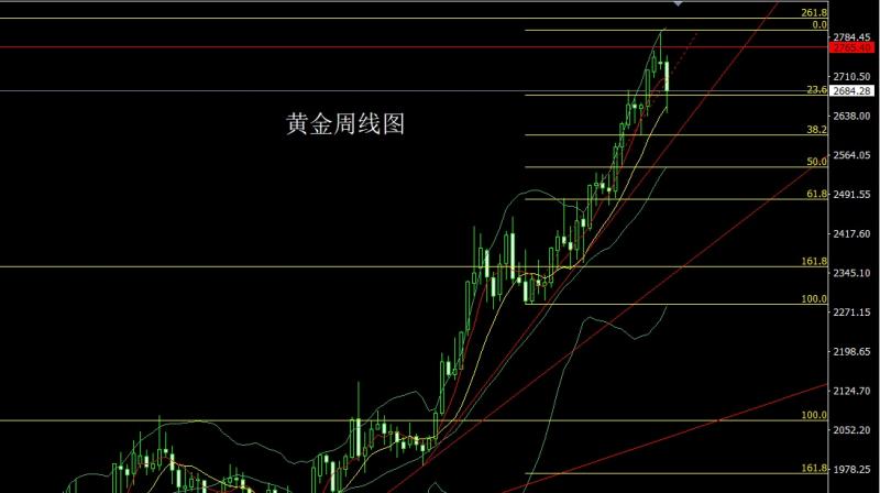 上周黄金市场强势回落,周初行情开盘在2684.7的位置后行情小幅拉升给出2687.1的位置后行情强势回落,盘中受到基本面利空因素的打压和技术获利了结的共振作用跌破多重支撑,周线最低给到了2535.7的位置后行情超跌整理,周线最终收线在了2561.5的位置后行情以一根下影线很长的大阴线收线,而这样的形态收尾后,本周市场依