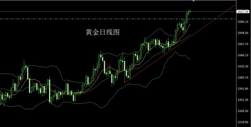 昨日黄金市场早盘开盘在2607.5的位置后行情小幅拉升给出2618.9的位置后美盘开始时段受到基本面影响短期快速回落,日线最低给到了2602.1的位置后行情瞬间强势拉升,随后高位震荡反弹,日线最高触及到了2631.5的位置后行情整理,日线最终收线在了2630的位置后行情以一根下影线很长的大阳线收线,而这样的形态收尾后,日线