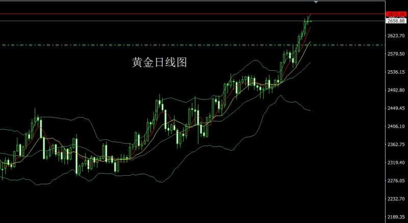 昨日黄金市场早盘开盘在2628.3的位置后行情先拉升给出2640.3的历史高点后行情震荡回落,日线最低给到了2622.2的位置后行情震荡拉升,美盘时段行情破位早盘给出的高点后行情加速上行,日线最高触及到了2664.6的位置后行情整理,日线最终收线在了2657的位置后行情以一根上影线稍长于下影线的大阳线收线,而这样的形态收尾