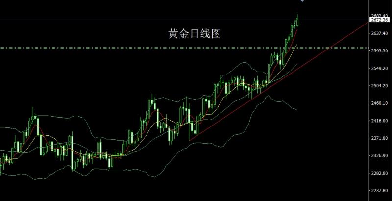 昨日黄金市场早盘开盘在2656.7的位置后行情回踩2655的位置后行情震荡拉升,日线最高触及到了2685.8的历史新高的位置后行情冲高出现获利了结过程,日线快速回落最低给到了2654.4的日线低点后行情二次拉升,日线最终收线在了2672.3的位置后行情以一根上影线很长的中阳线收线,而这样的形态收尾后,今日的行情有延续的冲高