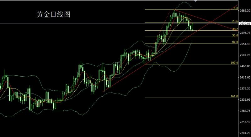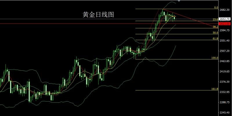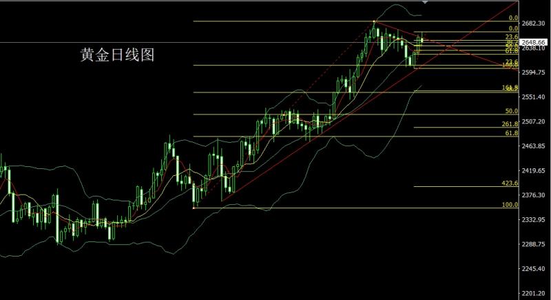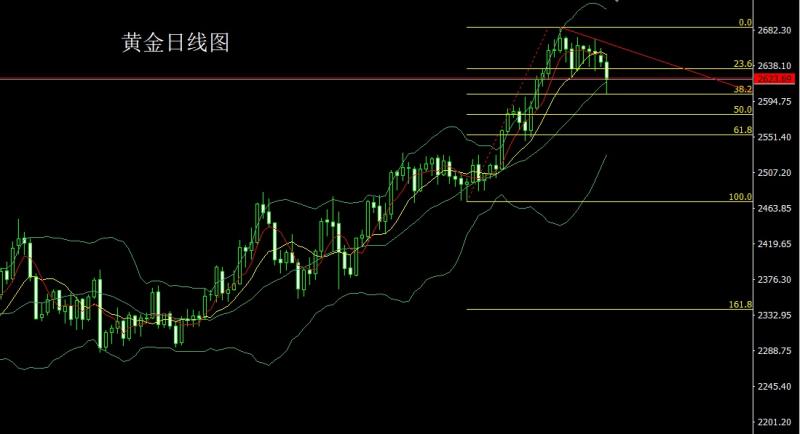 昨日黄金市场早盘开盘在2642.8的位置后行情小幅拉升给出2649.2的位置后行情震荡回落,美盘给出2628.4的位置后行情快速拉升,日线最高触及到了2653的位置后行情美盘时段快速回落,日线最低给到了2604.6的位置后行情受到本轮上行斐波那契的38.2支撑快速反弹,日线最终收线在了2621.9的位置后行情以一根下影线长于上影线的
