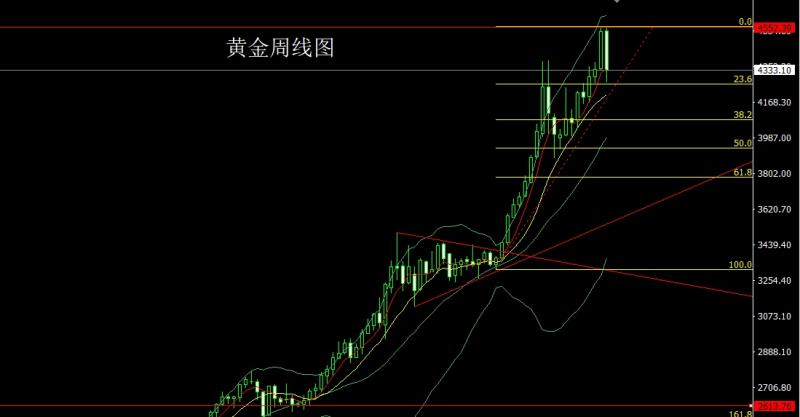 上周黄金市场周初开盘在4536.4的位置后行情先拉升给出历史高点4551.2的位置后行情出现获利了结过程强势回落,周线最低给到了4274的位置后行情收到本轮上行斐波那契的23.6支撑低位区间整理,周线最终收线在了4333.1的位置后,周线以一根下影线很长的大阴线收线,而这样的形态收尾后,周线阴包阳,本周市场市场有回落压力