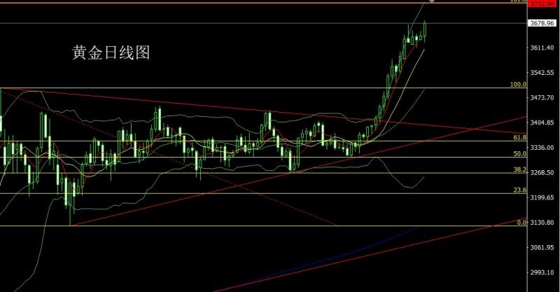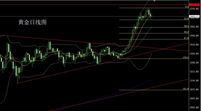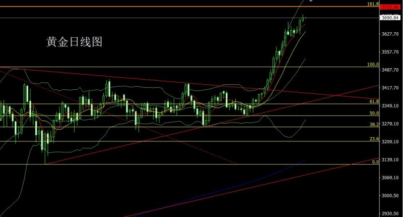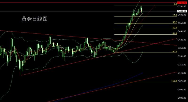 昨日黄金市场开盘在3690.1的位置后行情先小幅拉升给出3695.8的位置后行情震荡回落,美盘开始时段给出3659.1的位置后行情强势拉升,日线最高触及到了3707.8的历史新高后行情尾盘强势回落,日线最低给到了3645.6的位置后行情整理,日线最终收线在了3657.1的位置后,日线以一根上影线稍长于下影线的大阴线收线,而这样的形
