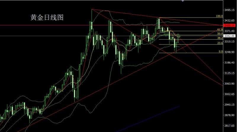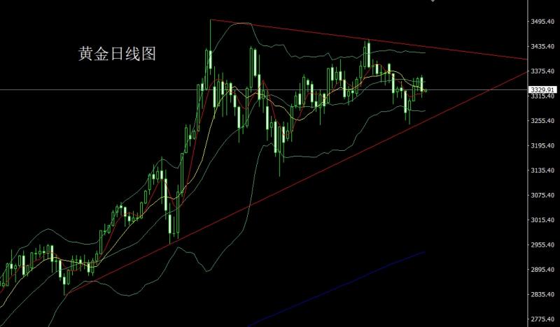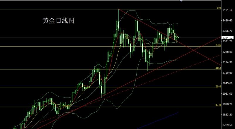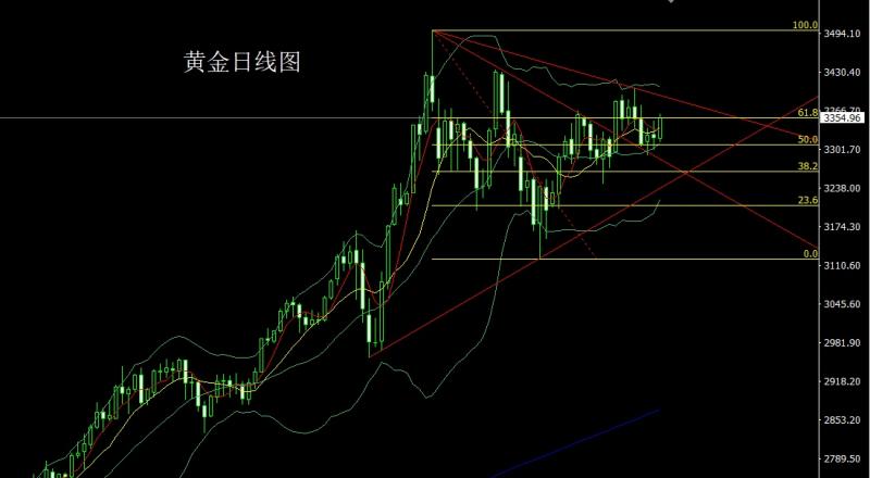 昨日黄金市场区间盘整,早盘开盘在3324.3的位置后行情先拉升,日线最高初级到了3337.6的位置后行情快速回落,日线最低给到了3311.3的位置后行情尾盘受到讲话影响拉升,日线最终收线在了3332.1的位置后行情以一根下影线较长的孕线锤头形态收线,而这样的形态收尾后,今日的行情在技术上有一定的反弹需求,点位上,今日332