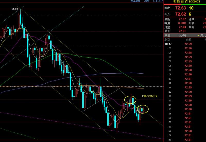 第三,原油方面:昨日白盘一路慢涨,一直观望至美盘,才出现小时线失守10均线,结束逼空后,则容易带来一波下探,成功把握一波,最低触及71,这里刚好是618分割支撑点,提示看企稳的位置,只是触及的时间有些晚了;