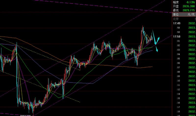 第四,黄金小时线级别:隔夜承压2041.7小幅回落至2035,收盘并未站上2038上,今日直接低开至2030一线,午后震荡小幅走高,目前承压2037;从macd角度看,价格拉高也容易形成顶背离承压;从通道角度看,下轨支撑上移2028-29一线,若失守此处,则短期又会走弱;