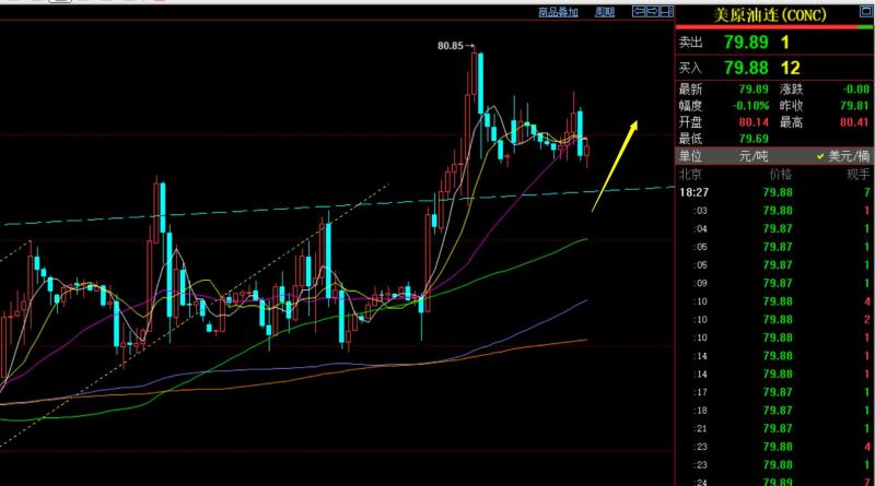 第三,原油方面:79.4突破站上后,也向上迎来一波拉高至80.8;