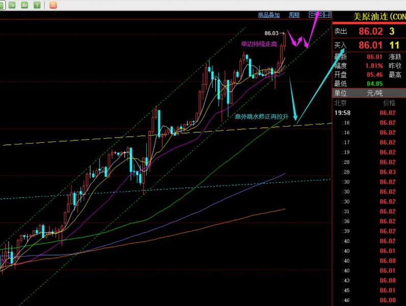 第三,原油方面: 短线方面,这几天并不理想;原本以为它还要日线通道内继续高位整理反复,一直等回测跟多,但走势却始终是一路逼空慢涨,因而没忍住尝试了阻力位短空,但要么下滑空间不大,要么横盘于阻力位不动,最终仍是继续向上破高;因此,这几日短线布局原油是失败的,不过好在前期手中一直持有78.2、78.1、76.9等波段多单底仓;昨日见欧盘持续走高,日线突破5个月以来的通道上轨,则放弃了震荡思路,以单边拉升来看待,不管是研报指出的84.45多,还是稍激进84.9多,今日都延续了破高上涨;