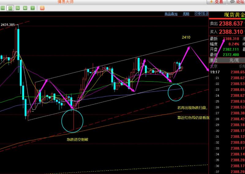 第三,黄金小时线级别:这几日预判以慢上行通道来发展,图中白色通道来推演,触及下轨支撑企稳或 刺破后收盘于下轨之上,都是看涨信号;原本今日以为会继续走循环,早间先冲,欧盘回测,美盘拉升;但今日并不是,亚盘横盘于凌晨支撑2380之上数个小时后,先向下诱空跌了一波,靠近通道下轨,也是日线5均线后,欧盘迎来一波上冲,不过还暂时未突破隔夜高点,因此还处于通道之内慢上涨来对待;下轨支撑2372,上轨阻力2410,今晚先关注此区间;