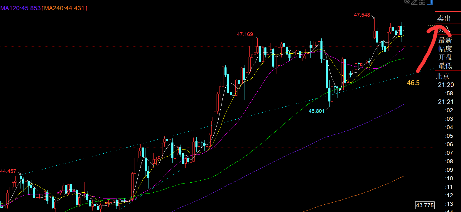 白银方面:同样,日线也未回踩5均线到位,直接发力一波上攻,趋势一直向上是没错的,就是日内最佳的看涨点不给机会; 所以今晚也是看涨但不追涨了,期待给一个日线5均线的回踩机会去跟随趋势看涨,刺破也最好,拉的越低,修复一下,横盘整理一下,后期才能拉的更远;46.4-46.5支撑上看涨;
