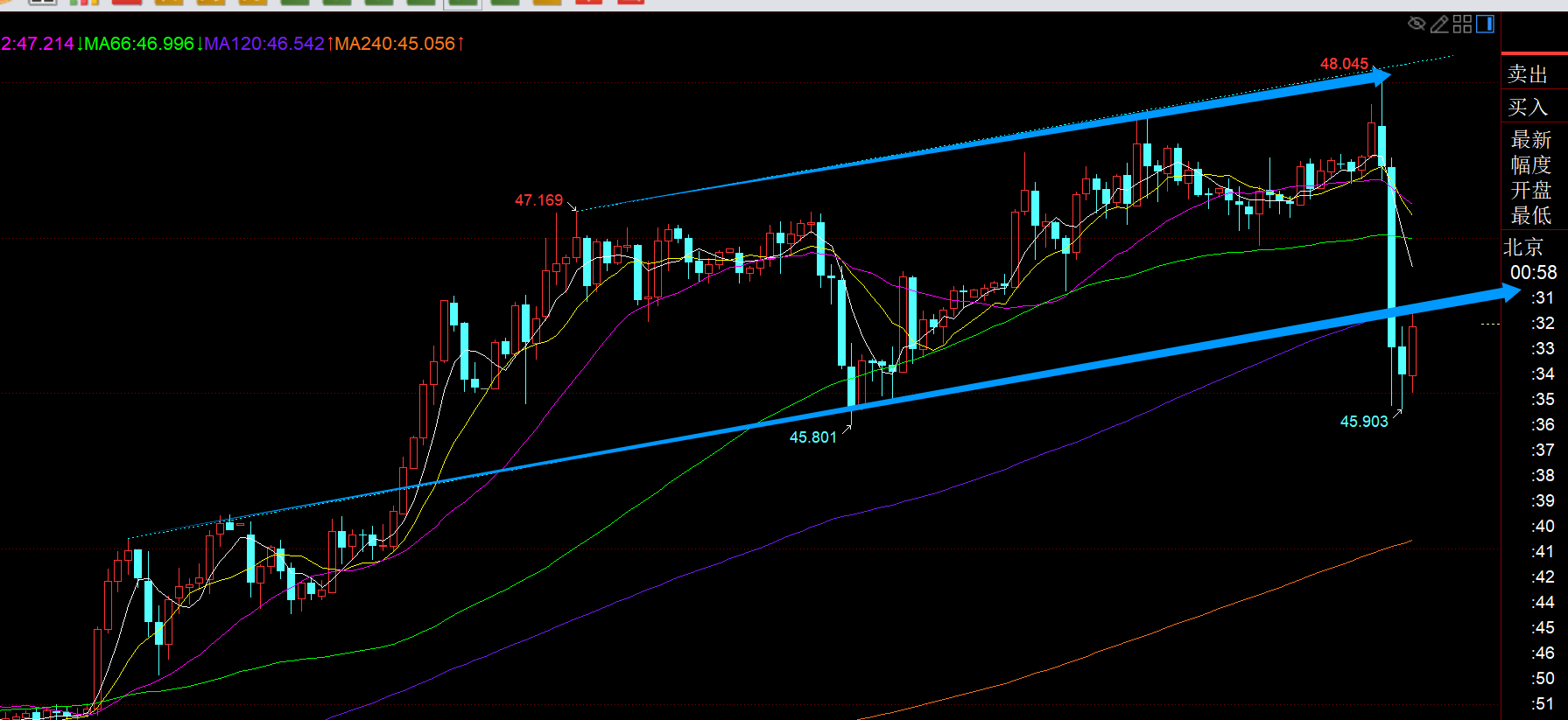 第二,白银方面:前日是和黄金一样,早间都做出了 再次盈利对冲手中几个底仓中长期波段看涨持仓,就是防止后面出现的短期跳水修正,今日果然还是来了;而昨日白天一直未有机会电脑上画图,也就不去布局,回来一画,48高位刚好就是下图中的通道上轨阻力位,丝毫不差;
