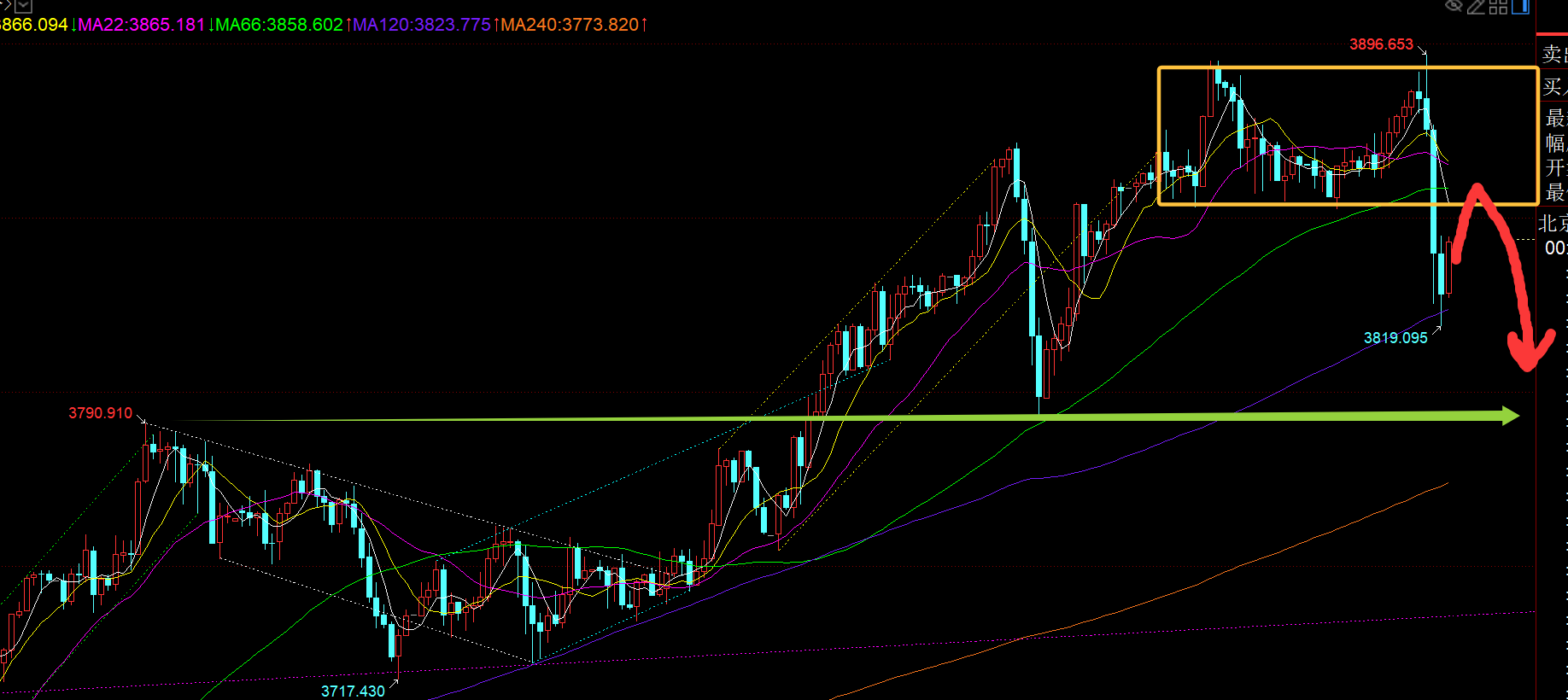 第三,黄金小时线级别:从上图看,3853-3897高位箱体整理区间被下破了,3853一线就成为一定反压,66日均线失守后,也成为反压,大概3858一线;因此,一波下跌跳水之后,3853-58等早盘触及后承压,则可以继续看跌回落,也是50分割阻力位,下方重点关注绿色线支撑3790上,若守不住它,也就守不住日线10均线,则会进一步扩大下跌修正力度;能守住,则可以反手低位看涨;另外,年均线支撑也要留意下,它是刺破3790后,能触及的下一个关键支撑,9月18日当时就是下探稳住年均线后又迎来了一轮单边大幅强攻;因此,等今日亚盘早间开盘后,先触及3853-58承压看跌回落,延续下调,若小时线重新突破站上3858上方,则需调仓,下方目标看3800-3790,然后就是观察3790的有效得失,刺破的话关注年均线的支撑企稳信号;只有短期下行修正到位了,才好继续有勇气,有力度,有持续性的看单边上涨延续;