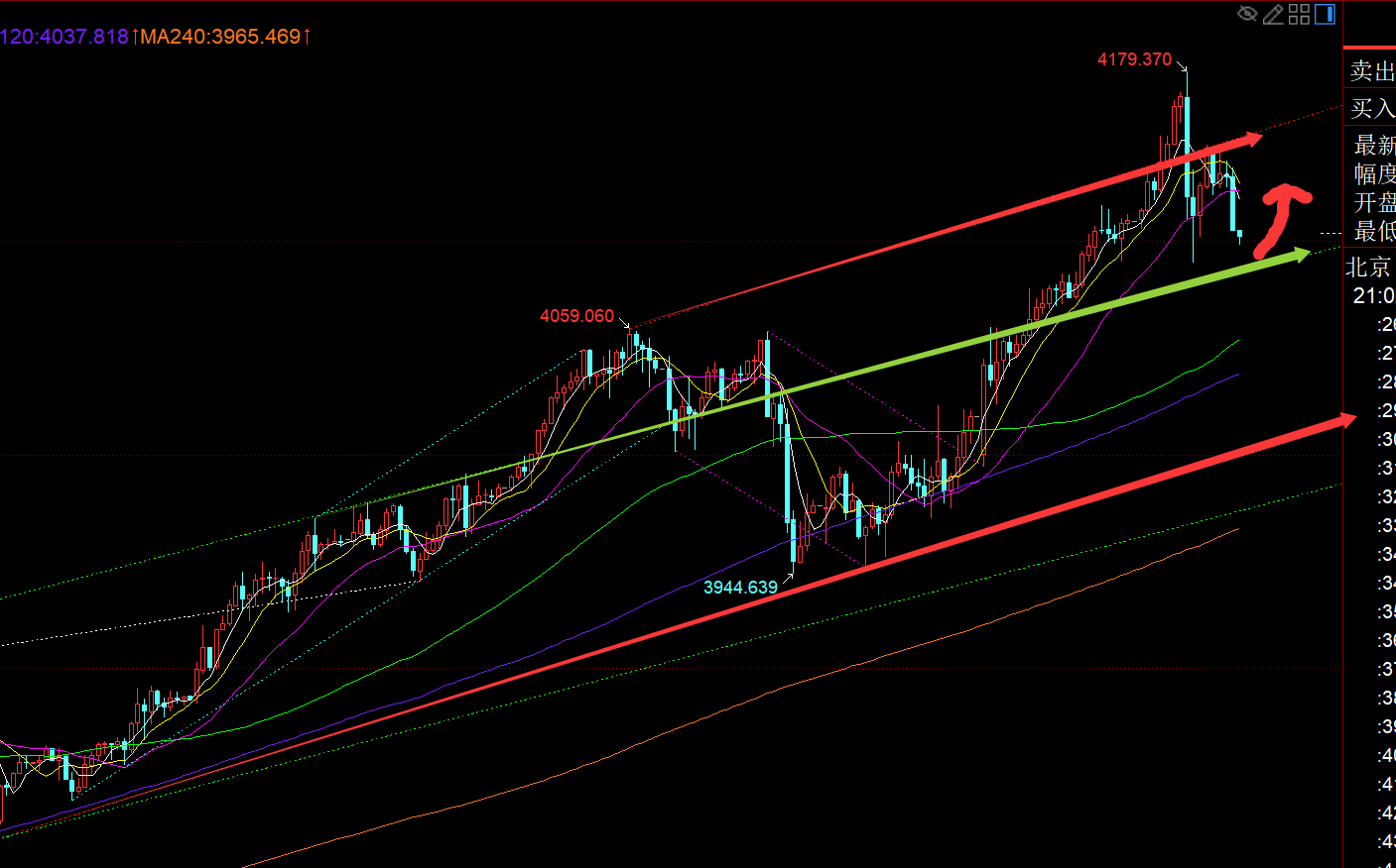 第一,黄金日线级别:今日动静依然较大,早间先拉升70米,午后跳水90米,欧盘反抽50米,美盘此时又打压40米,上下剧烈震荡,此时形成一根较长上影K,今夜一旦无法反补回去,就意味着明日还要延续下调,去考虑短期5均线,或刺破它,再寻求企稳;从9月22日开始,一直在走相似的走势形态循环,当出现一根大阳突破前面横盘压力位之后,紧跟着是四个交易日的高位整理后再继续出大阳破高,再四个交易日整理,再出大阳,已走了三个循环,昨日大阳K是第四次出现,也可能走第四个循环;因此,大阳K之后,一般第二根K都是继续收阳,第三根或第四根再进行回踩一波去确认5均线支撑有效后,第五根K继续出大阳;所以,今天预计不太可能直接试探5日,收盘价也应该处于开盘价4110.6之上收阳K;