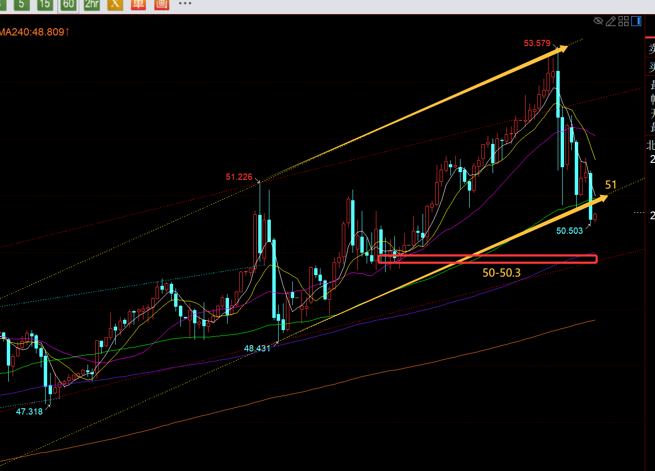 白银方面:欧盘震荡打压一波,触及图中黄色通道下轨51支撑,反弹了一波,随后又打压破了新低至50.5,这个位置逐步靠近日线5均线50.3; 因此,白银来讲,它有些一步修正到位的迹象,而日线只要维持5日之上,依然是强势单边慢涨拉升中;因此,今晚留意50.3上下企稳看涨反弹; 或者重新突破51,回到黄色通道之内,再回踩确认下轨企稳去跟随反弹震荡,阻力52下;