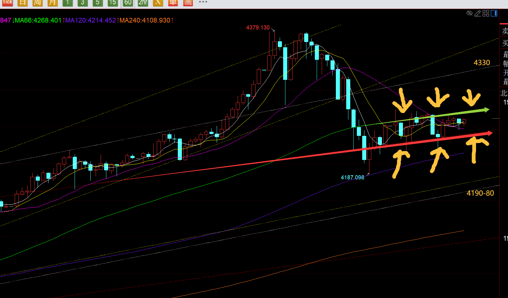 第三,黄金小时线级别:一般来讲,隔夜大跌之后,第二天会寻求凌晨反弹高点或分割阻力位,或中轨,大阴等阻力来尝试是否延续下跌,尤其是早间开盘先向上急拉的话,是很容易不延续而冲高回落;一早先拉升,承压4273.5一线回落,于周视频提及的4277压力略差,第一次跌至4218反弹再测试4270一线,4218这个位置刚好是618分割支撑;午后承压4270也是靠近中轨压制一波,跌至4221,又企稳反弹至4265;价格来来回回的反复,看似杂乱无章,其实它可能在走一个收敛三角整理,高点逐步慢下移,低点逐步慢抬升,也可以看做是一个平行通道整理,风水岭阻力4274,风水岭支撑4220左右,50米范围内运行;另外这种快速短线上下来回走的行情,稍犹豫要么进不去相对好的高低点,要么有了利润想贪,就打回你原点位,要么你为了求保,下移防守打了再抵达你原本的目标空间;所以,只能见好就收,但最终它肯定会打破平衡,走一个方向去突破或扩大震荡区间,就要留意66日均线阻力4268一线,以及4274亚盘高点,如果向上突破这两个阻力,是连阳突破或大阳突破66日之后,那么才可以考虑回踩去跟随看涨,至少可以做一波次高点,看618分割阻力4305,甚至前期通道衍生反压点4330之下;反之,若无法突破这两个阻力位,是可能存在一波向下打压的,尤其是有效破位图中红色趋势线对应当前支撑4240,同样也要连阴或饱满大阴跌破才算有效,那么可以去试探上周五低点4190-4185范围,看它得失;当然,只要敢再拉低,macd就会出现底背离,企稳会出现相对不错的后市低位看涨点;上升趋势不会改变,下跌调整修正都是为了后市进一步刷历史新高做准备的;