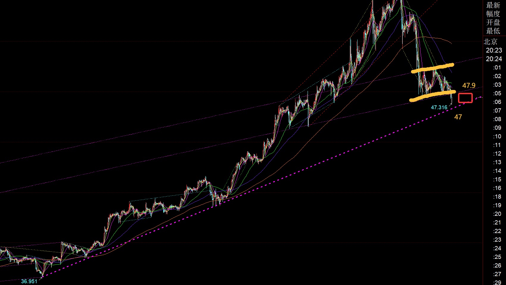 白银方面:从图中看,欧盘也是下破底部整理区间,47.9一线称为反压点,要二次下跌,一定不能突破再站上它,下方支撑就是36.95一路单边支撑起来的紫色趋势线,对应的支撑点47一线,触及企稳则尝试看涨反弹;所以留意47.9-47区间内运行,注意得失情况;